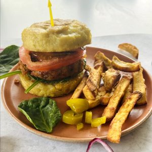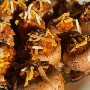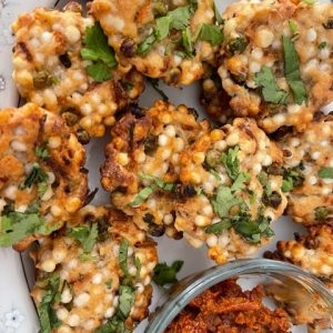 It is an exotic tropical colorful salad. It exudes freshness and is made with grated raw mango, grated coconut along with added color from tomatoes, edamame, carrots, and tofu. A spicy soy dressing paired well with this Asian inspired salad.